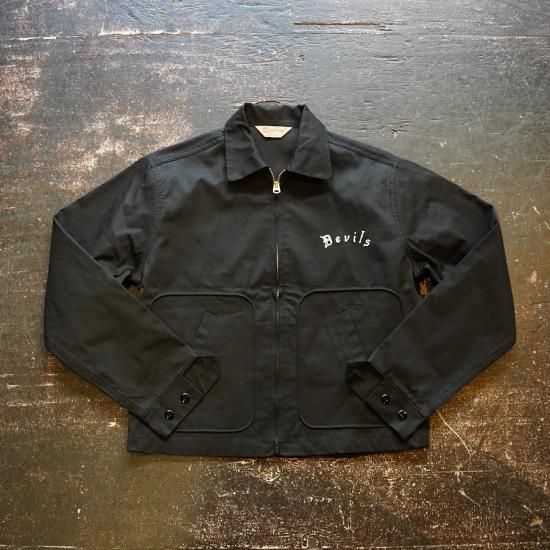 グルービンの定番、1940年代ヘラクレススタイルのコットンジャケット。今年の一重ジャケットは、当時実在してもおかしくないDEVILSのモーターサイクルクラブが刺繍されたデザインです。シルエットはタフな男前ショート、タロンジップに王道のブラックベースになります。