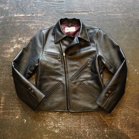 グルービンの定番、1940年代のオンス薄目のダブルライダースジャケット。アクションプリーツ型になります。シルエットも抜群、スラックスにもデニムにも幅広く融合する抜群のデザインです。